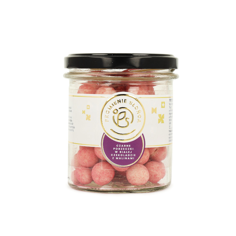 Liofilizowane czarne porzeczki w białej czekoladzie z malinami w słoiczku 120 g