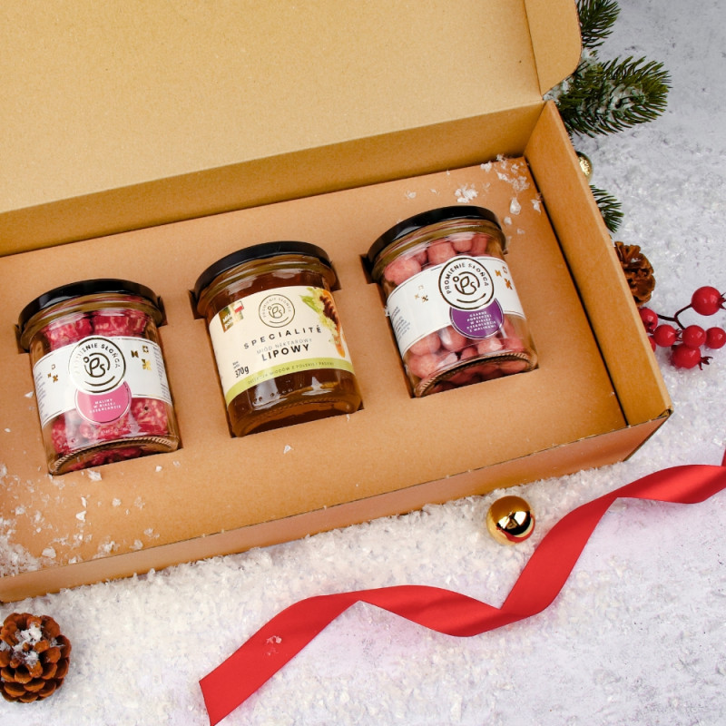To zestaw, który łączy w sobie naturalne smaki, elegancję i świąteczne ciepło. Doskonały jako prezent dla miłośników słodyczy w naturalnym wydaniu – bez przesady, za to z nutą wyjątkowości. Owocowe przysmaki w białej czekoladzie wprowadzają lekkość i kolor, a miód lipowy dodaje im harmonii i naturalnej słodyczy. Całość zapakowana w szklane słoiczki prezentuje się elegancko i z klasą, tworząc upominek, który urzeka prostotą i smakiem natury.
