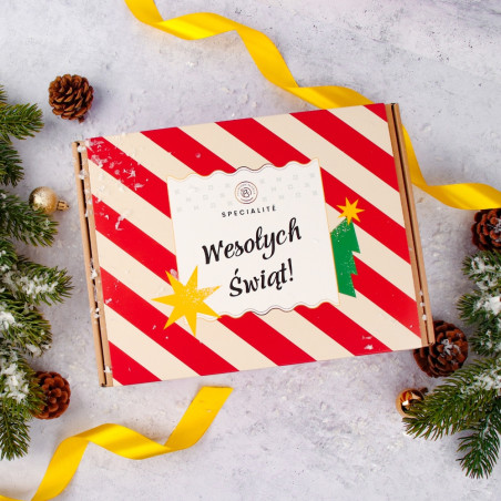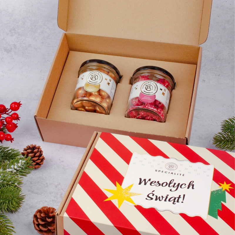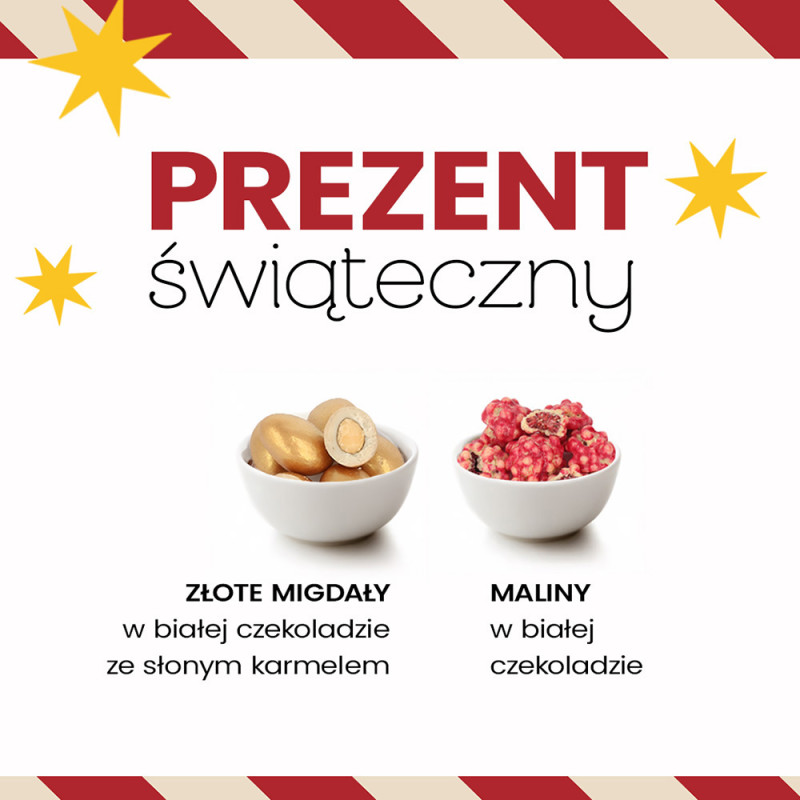W świątecznym zestawie znalazły się dwa wyjątkowe przysmaki, które łączą w sobie elegancję, delikatność i odrobinę świątecznej magii. To złote migdały w białej czekoladzie ze słonym karmelem – chrupiące, prażone orzechy otulone aksamitną polewą o subtelnie karmelowym smaku. Obok nich znajdują się maliny w białej czekoladzie, które urzekają lekkością i owocową świeżością połączoną z kremową słodyczą czekolady.
