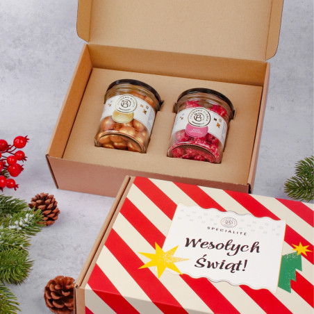 To eleganckie połączenie smaków, które zachwyca prostotą i wyważeniem. Złote migdały wprowadzają nutę luksusu, a maliny – naturalną, owocową świeżość. Razem tworzą duet idealny: słodki, subtelny i pełen harmonii. Każdy produkt zamknięty w szklanym słoiczku prezentuje się niezwykle estetycznie, dzięki czemu zestaw doskonale sprawdzi się jako świąteczny upominek lub słodki akcent w zimowych chwilach przyjemności.