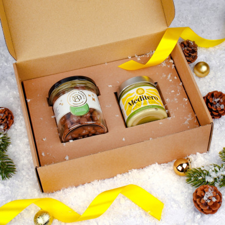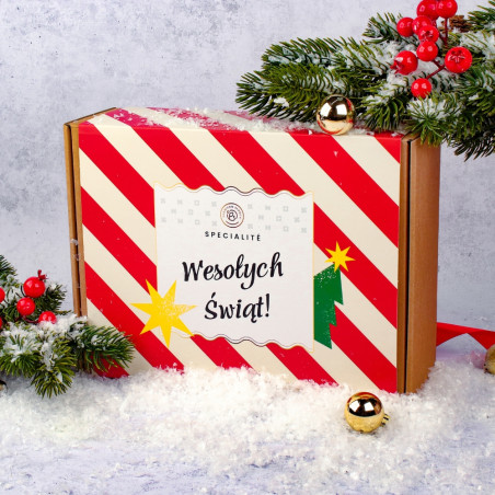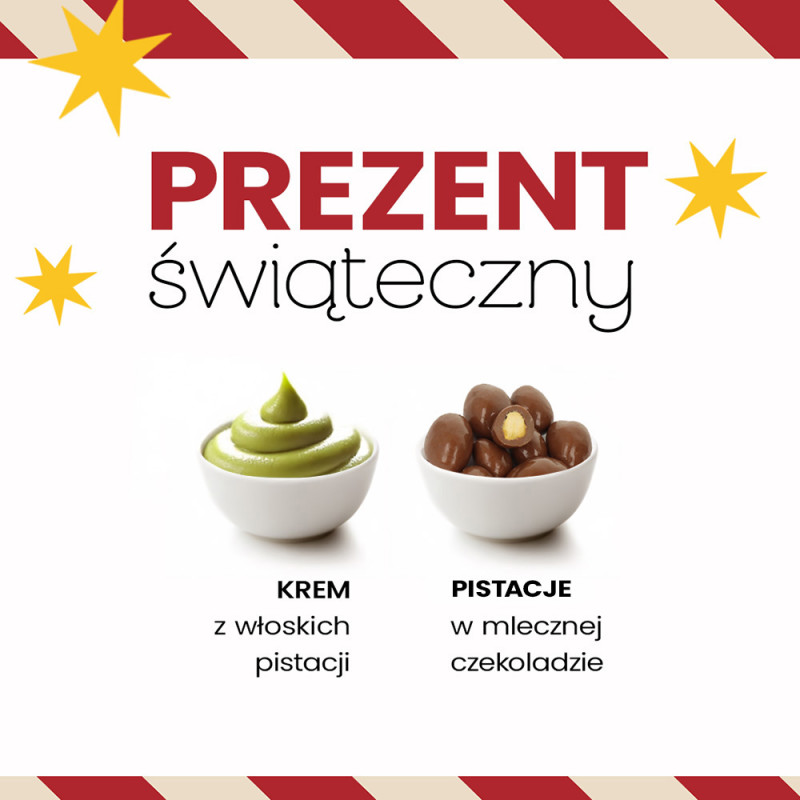 W świątecznym zestawie znalazły się dwa wyjątkowe produkty stworzone z myślą o miłośnikach pistacji i delikatnej słodyczy. To pistacje w mlecznej czekoladzie – wyjątkowo chrupiące, o pełnym, lekko słonym smaku, otulone kremową warstwą czekolady, która podkreśla ich naturalny charakter. Obok nich znajduje się krem z włoskich pistacji Meditero – gładki, intensywnie orzechowy, przygotowany według tradycyjnej receptury, z najwyższej jakości pistacji pochodzących z Włoch.