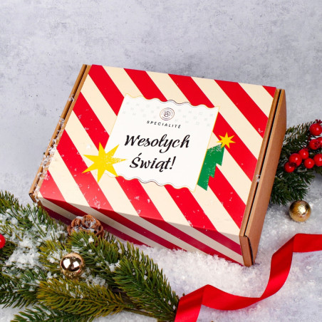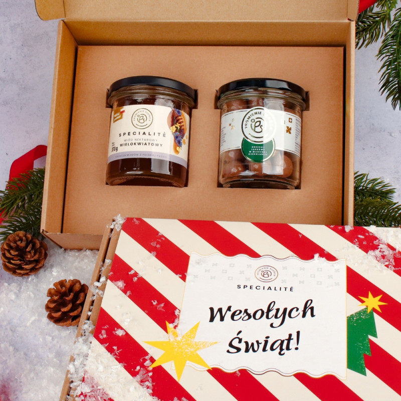 W świątecznym zestawie znalazły się dwa produkty, które idealnie łączą naturalną słodycz i delikatną elegancję. To miód nektarowy wielokwiatowy – złocisty, aromatyczny i pełen smaku natury, w którym zamknięto esencję kwiatowych nektarów. Obok niego znajdują się orzechy laskowe w mlecznej czekoladzie – chrupiące, aksamitnie słodkie i doskonale zbalansowane w smaku. Razem tworzą zestaw pełen harmonii i prostoty, w którym natura spotyka się z subtelną słodyczą.