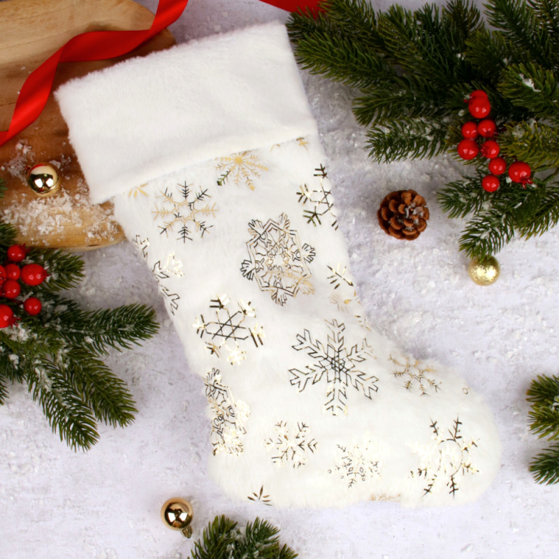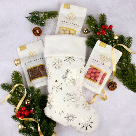 Całość przygotowana jest do spakowania w eleganckiej, białej skarpecie z miękkiego futerka, ozdobionej złotymi śnieżynkami.