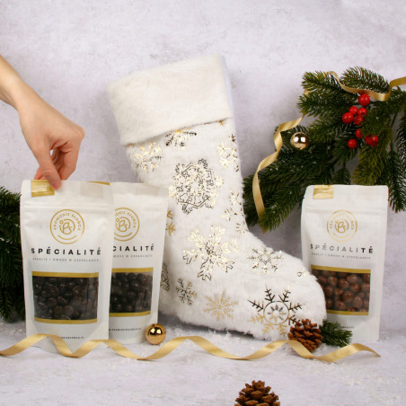 Całość zapakowana jest w białą skarpetę z miękkiego futerka, ozdobioną złotymi śnieżynkami – elegancką, przyjemną w dotyku i gotową do wręczenia bez dodatkowego pakowania.