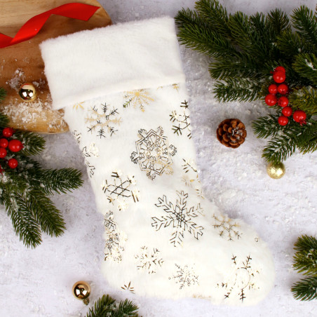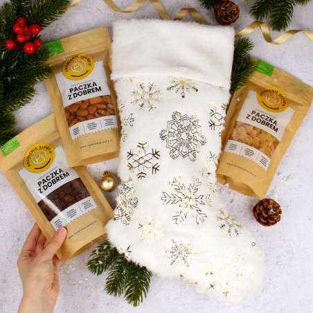 Całość zapakowana jest w białą, miękką skarpetę ozdobioną złotymi śnieżynkami, która prezentuje się pięknie zarówno w roli dekoracji, jak i gotowego prezentu.