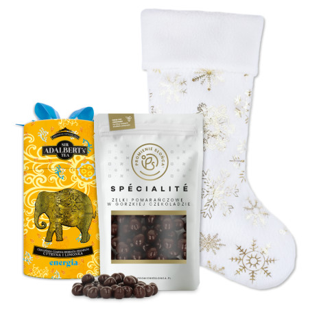 Całość uzupełnia świąteczna skarpeta zimowa — miękka, przytulna i nastrojowa, wprowadzająca klimat świąt i zimowych dekoracji. Dodaje zestawowi uroku oraz sprawia, że prezent wygląda jeszcze bardziej kompletnie i wyjątkowo. To nie tylko dodatek, ale również sympatyczny gest, który potrafi wywołać szczery uśmiech.