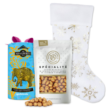 Wyrazistym, słodkim akcentem w zestawie są złote migdały w białej czekoladzie ze słonym karmelem 200 g. To elegancka, efektowna przekąska, w której chrupiący migdał spotyka się z aksamitną czekoladą i delikatnie słoną nutą karmelu. Całość jest nie tylko przepyszna, ale również pięknie się prezentuje — idealna na zimowe wieczory, do kawy, herbaty lub jako mała, luksusowa przyjemność.
