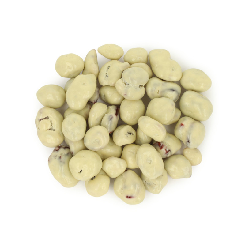 kandyzowana żurawina w całości 50% (żurawina, cukier, olej słonecznikowy), biała czekolada 49% [cukier, masło kakaowe, mleko w proszku, emulgator: lecytyny (soja), ekstrakt waniliowy], mieszanka glazurująca 1% [syrop glukozowy, substancja glazurująca (guma arabska, szelak), oleje roślinne (kokosowy, rzepakowy), dekstryna].
