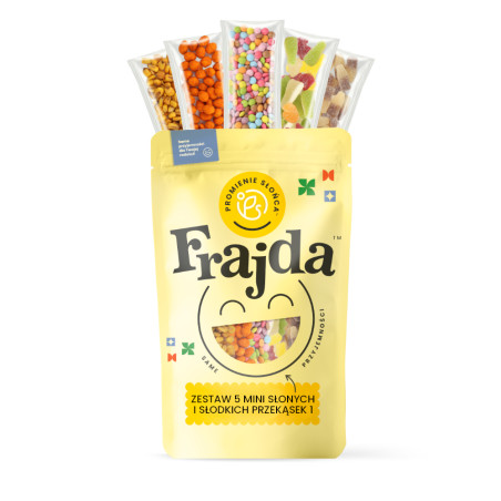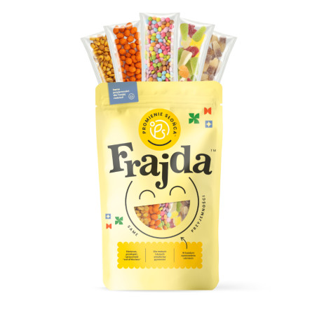 Saszetki z przekąskami mają od 35 do 70 gramów w zależności od produktu. Każdy z nich znajduje się w osobnym opakowaniu, które są włożone do naszej frajdowej torebki. Ma ono praktyczne zamknięcie strunowe, ułatwiające późniejsze przechowywanie, i okienko przez które można zajrzeć do środka opakowania bez konieczności otwierania go. Saszetki z przekąskami możesz jeść każdą osobno lub otworzyć je na raz, wsypać do torebki i zrobić z nich pyszny mix.