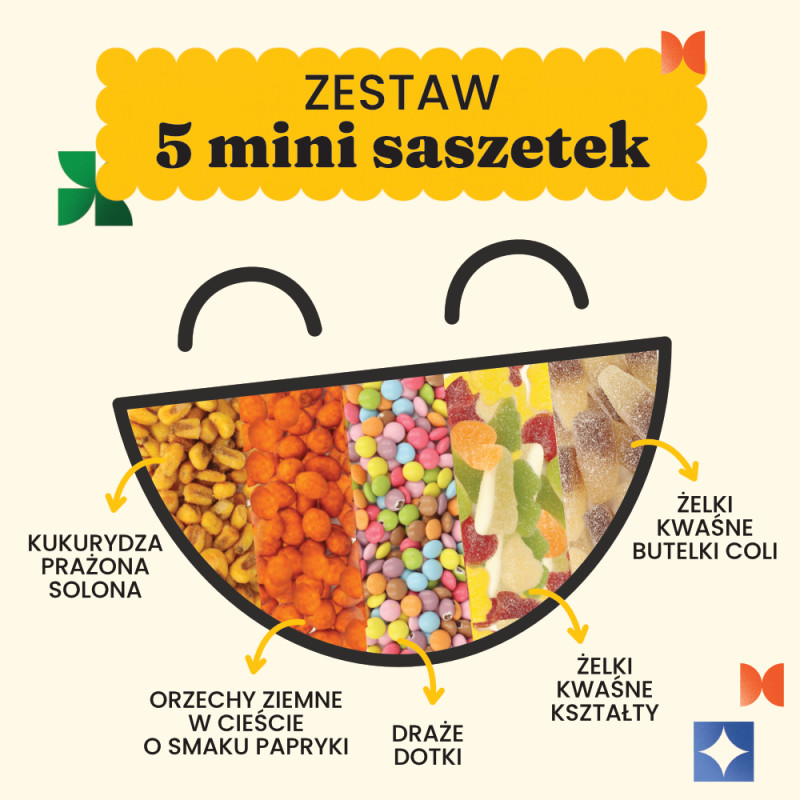 W naszym sklepie internetowym dostępnych jest kilka rodzajów specjalnych zestawów ze słonymi przekąskami i słodyczami. Ta wersja to balans pomiędzy tymi smakołykami. Z pewnością każda osoba znajdzie w nim pyszności, które przypadną jej do gustu. Łączy w sobie nasze kultowe żelki – żelki kwaśne butelki coli i żelki kwaśne kształty – kolorowe draże dotki oraz uwielbiane orzechy ziemne w cieście o smaku papryki, a także kukurydzę prażoną soloną.
