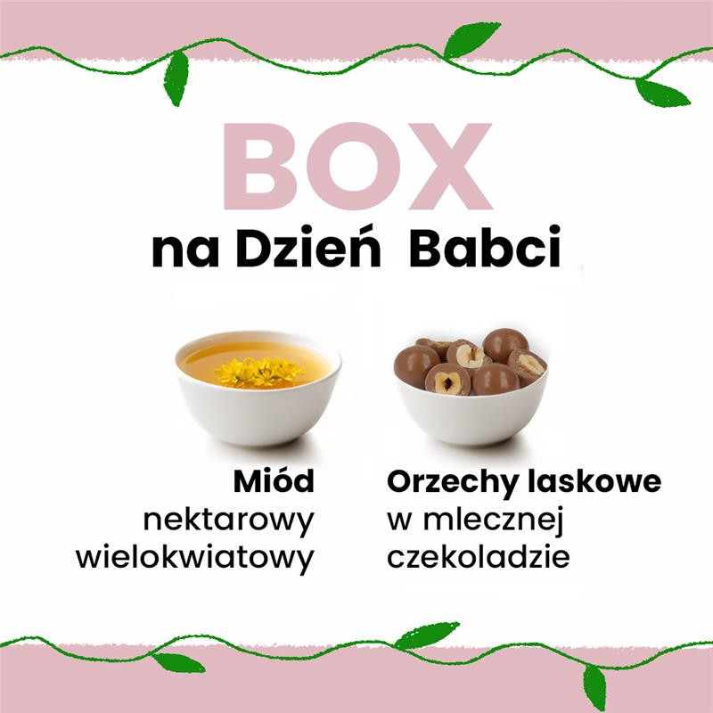 Ta wersja prezentu skrywa w sobie dwa produkty: miód nektarowy wielokwiatowy oraz orzechy laskowe w mlecznej czekoladzie w słoiczku – prosta klasyka, która prawdopodobnie zadowoli każdego. Miód możesz dodać do wypieków lub rozgrzewającej herbaty, natomiast orzechy wyśmienicie smakują solo, ale też jako dodatek do słodkich posiłków czy deserów.