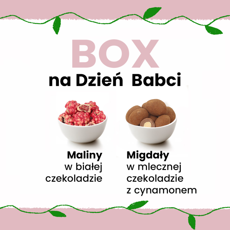 Zestaw Prezentowy na Dzień Babci z malinami i migdałami w czekoladzie to opcja dla osób, które lubią sięgać po słodkie łakocie. Maliny liofilizowane w białej czekoladzie to produkt, po zjedzeniu którego natychmiastowo na twarzy pojawia się uśmiech. Migdały w mlecznej czekoladzie z cynamonem już samym swoim aromatem stwarzają wyjątkową atmosferę.