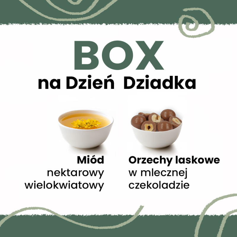 Ta wersja prezentu skrywa w sobie dwa produkty: miód nektarowy wielokwiatowy oraz orzechy laskowe w mlecznej czekoladzie w słoiczku – prosta klasyka, która prawdopodobnie zadowoli każdego. Miód możesz dodać do wypieków lub rozgrzewającej herbaty, natomiast orzechy wyśmienicie smakują solo, ale też jako dodatek do słodkich posiłków czy deserów.