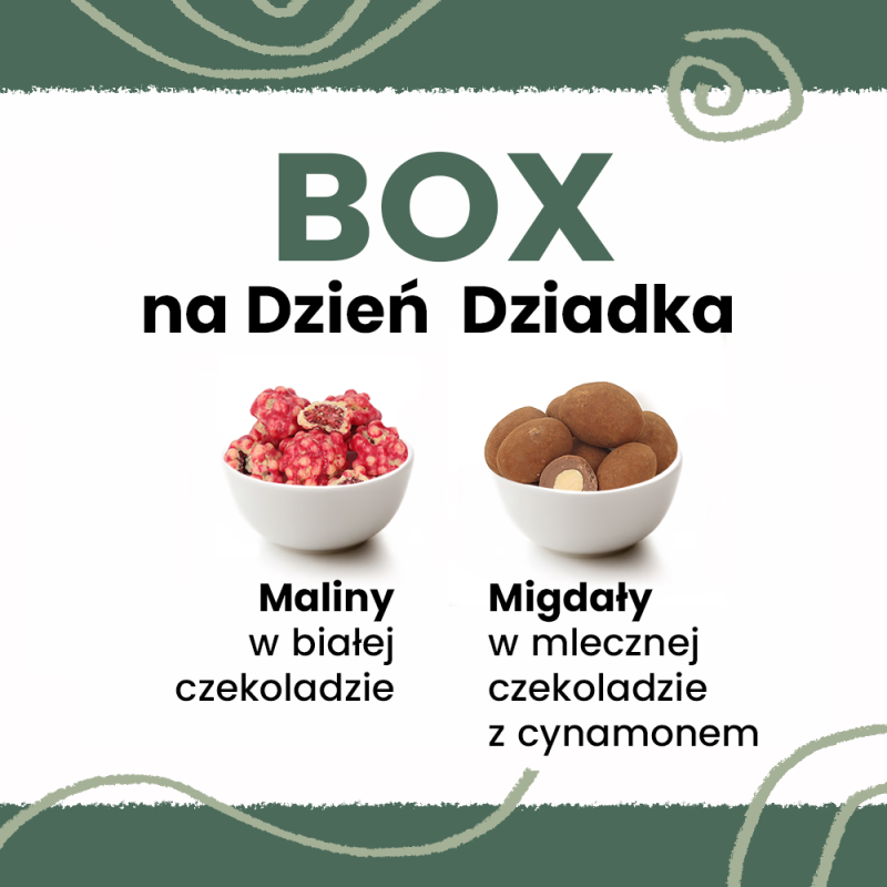 Zestaw Prezentowy na Dzień Dziadka z malinami i migdałami w czekoladzie to opcja dla osób, które lubią sięgać po słodkie łakocie. Maliny liofilizowane w białej czekoladzie to produkt, po zjedzeniu którego natychmiastowo na twarzy pojawia się uśmiech. Migdały w mlecznej czekoladzie z cynamonem już samym swoim aromatem stwarzają wyjątkową atmosferę.