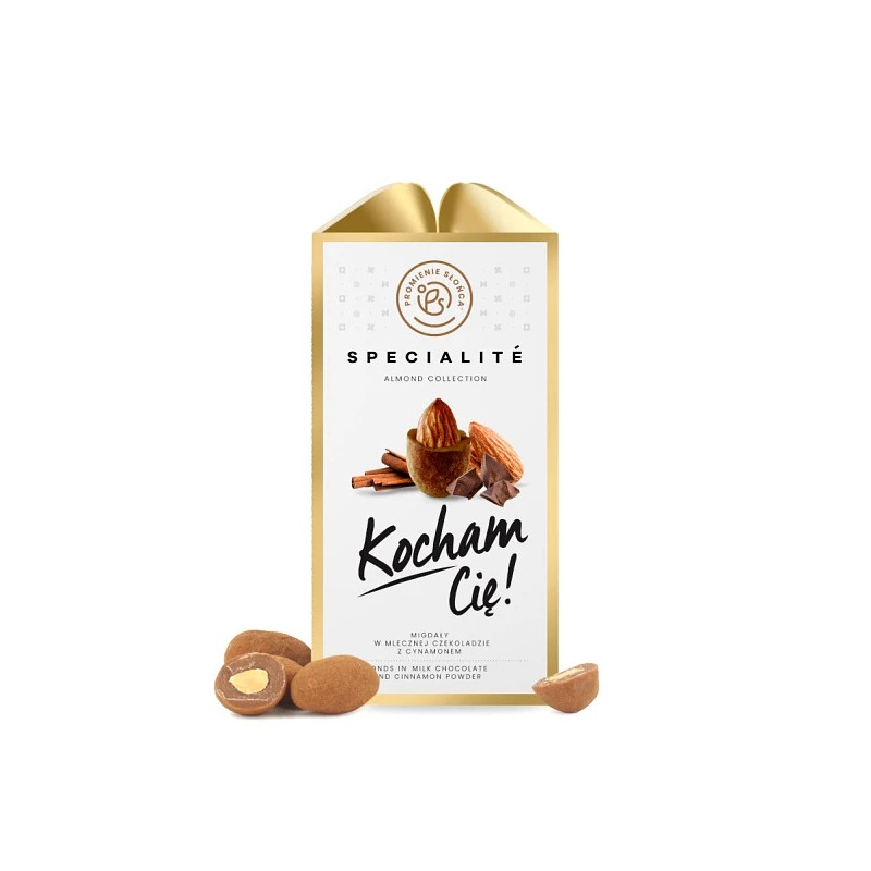 Składniki: czekolada mleczna 79% (cukier, masło kakaowe, mleko w proszku, serwatka w proszku, masa kakaowa, emulgator: lecytyna sojowa, ekstrakt waniliowy), migdały prażone 20%, cynamon mielony 1%.