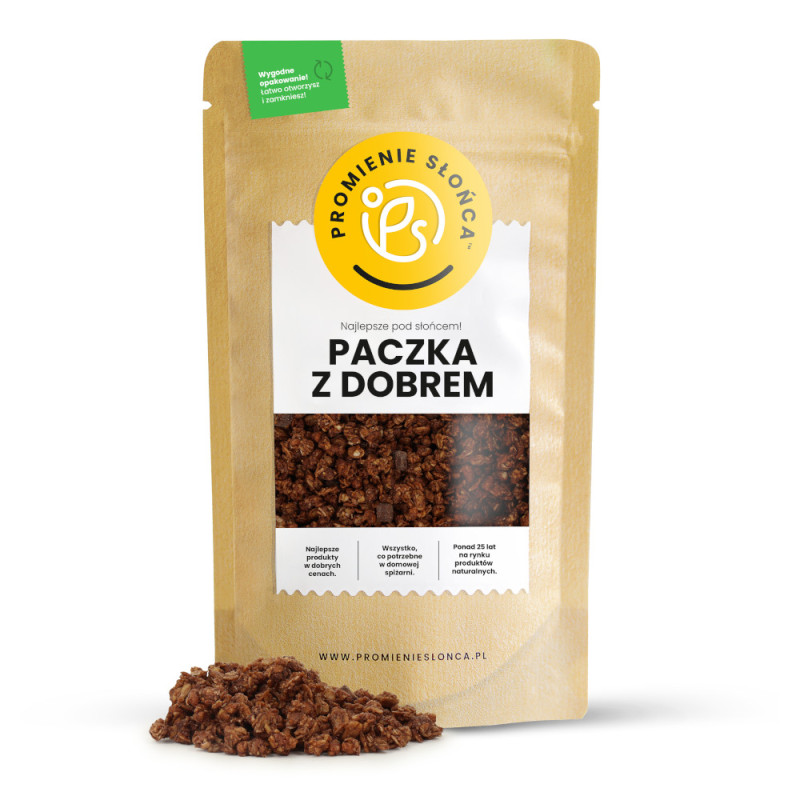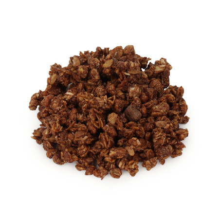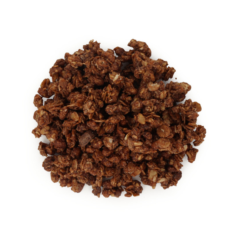 Nasza granola ma przyjemny czekoladowy smak. To idealna opcja dla zabieganych osób na szybkie śniadanie. Jest to też smaczna i zdrowa przekąska na przykład do pracy czy szkoły.