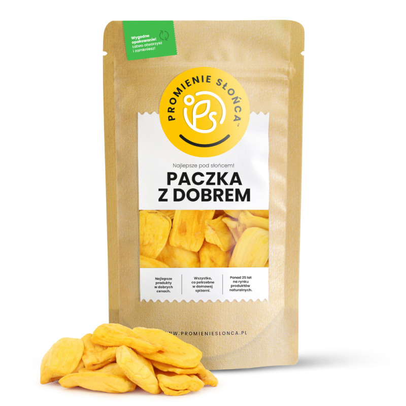 W naszej paczce z dobrem znajdziesz przede wszystkim suszone owoce chlebowca. W składzie jest też niewielki dodatek oleju palmowego, który między innymi ma za zadanie zapobiegać szybkiemu psuciu się owoców.