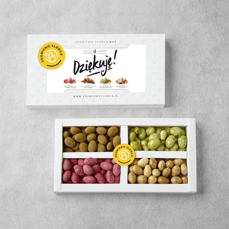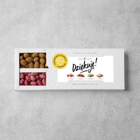 BOX „Dziękuję!” od Promieni Słońca to starannie wyselekcjonowana kompozycja słodkości w wyjątkowych smakach, stworzona po to, by w piękny i pyszny sposób wyrazić wdzięczność, sympatię i ciepłe emocje. W eleganckim białym pudełku zamknęliśmy cztery wyjątkowe warianty chrupiących migdałów oblanych pyszną czekoladą. To gotowy upominek, który zachwyca nie tylko smakiem, ale również formą – idealny, by powiedzieć komuś: dziękuję.